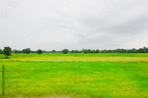 © Aphisith, Fototapeta premium Rice fields, young green rice plants