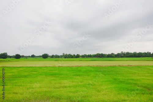 © Aphisith, Fototapeta premium Rice fields, young green rice plants