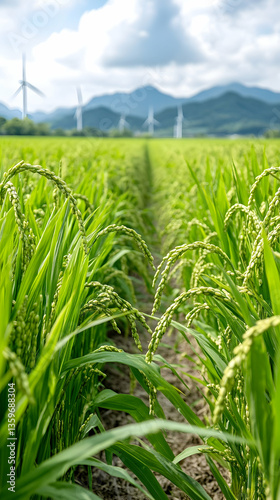 Obraz premium Rice paddy path, wind turbines, mountains
