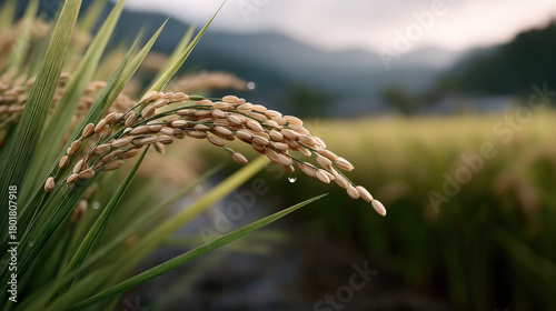 Naklejka premium Rice plant in field with morning dew, green leaves, golden grain, natural landscape, soft sunlight, peaceful rural scene