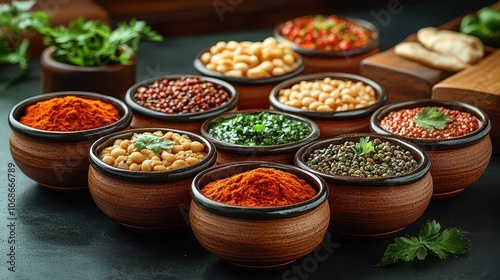 Fototapeta premium rich, aromatic indian food beautifully presented in bowls on a dark table, showcasing an array of spices and vibrant colors that invite indulgence