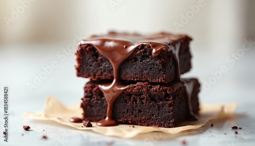 Naklejka premium Rich chocolate brownie slices stacked with melted chocolate glaze. Moist baked squares with gooey topping, perfect dessert for any occasion. Decadent sweet treat.