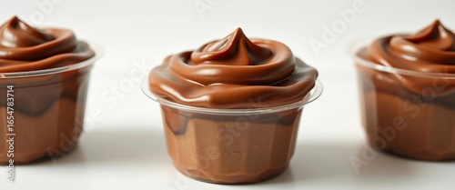 © Teepanun, Obraz premium Rich chocolate cream dessert in a clear plastic cup against a white backdrop, product shot, container