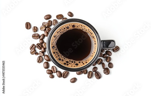 Obraz premium Rich coffee in a mug, surrounded by beans