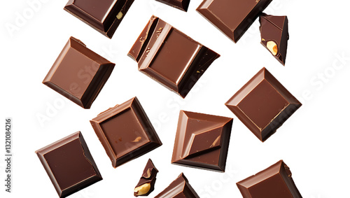 © Background & Texture, Fototapeta premium Rich Dark Chocolate Bars and Pieces - High-Quality Cocoa Confectionery with Smooth Texture and Glossy Surface on White Background