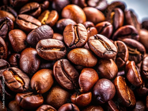 Naklejka premium Rich, dark roast coffee beans dramatically lit against a stark white backdrop.