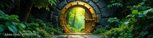 Obraz premium Rich gold vault door opens to reveal lush green forest emerging from darkness, prosperity, doors, growth
