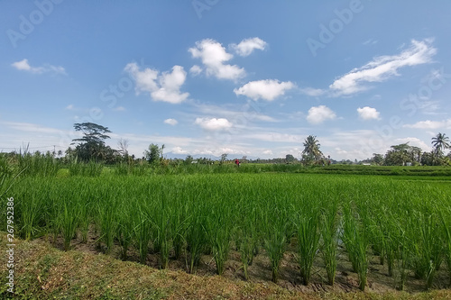 Obraz premium Rich green rice stepped fields. Traditional Balinese rice terraces. Jungles...