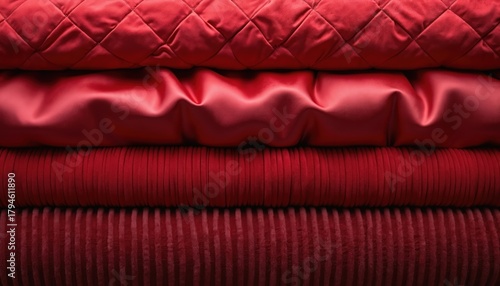 Obraz premium Rich red fabric layers stacked neatly. One is quilted, another shiny satin,...