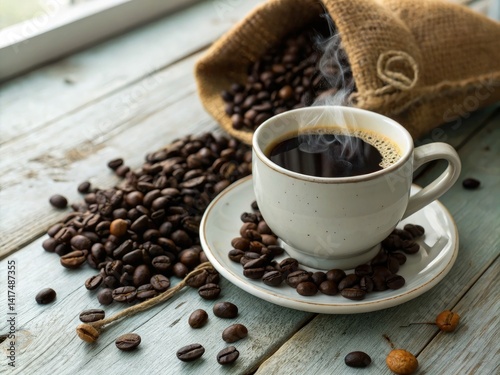 Fototapeta premium Rich, roasted beans beside steaming black coffee, photographed on a rustic...