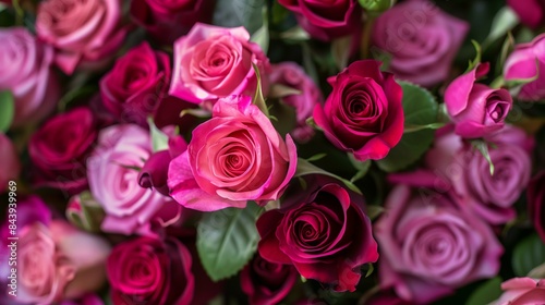 Fototapeta premium Rich, romantic, and lush, showcasing a close-up of fully bloomed roses in deep shades of magenta, pink, and burgundy