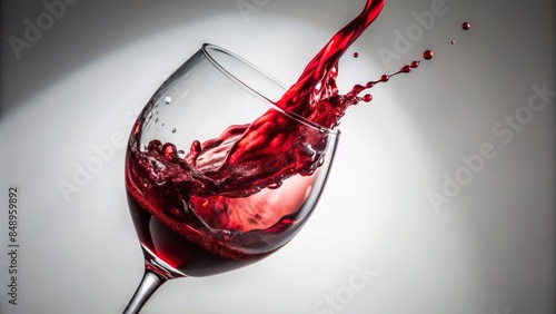 Fototapeta premium Rich, velvety red wine cascades into a delicate glass, creating a mesmerizing splash against a pristine white backdrop, exuding luxury and refined sophistication.
