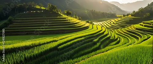 Fototapeta premium Rich views of terraced rice fields reflecting shades of green in the sunlight...