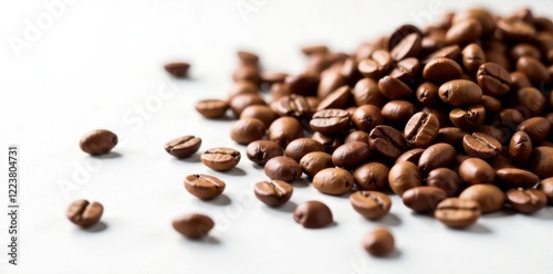Naklejka premium Richly colored coffee beans scattered on a white surface , coffee beans,...