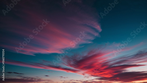 Fototapeta premium Richly colored red and pink clouds in a deep blue evening sky.