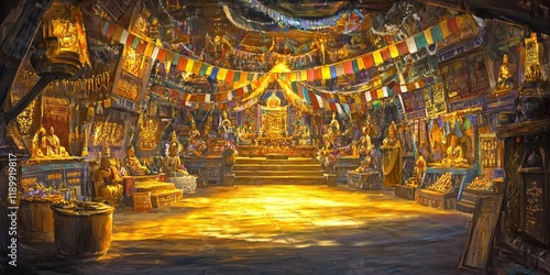© Trionorejo, Obraz premium Richly Decorated Temple Interior with Golden Light and Colorful Flags