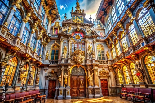 © kittipon, Obraz premium richly ornate guildhalls Baroque architecture bright morning sunlight stunning stained glass ornate wooden accents opulent decorative elements lavish details