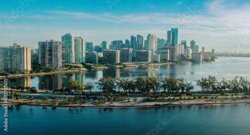 Obraz premium Rickenbacker Causeway and buildings along the waterfront of downtown Miami,...