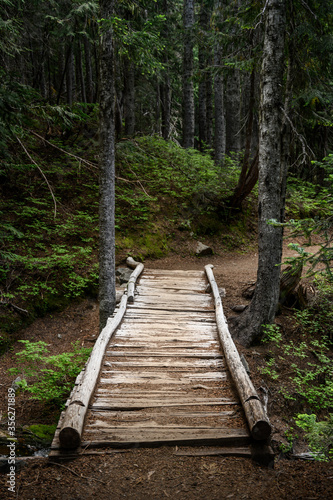 © kellyvandellen, Fototapeta premium Rickety Wooden Bridge Over Ravine in Forest