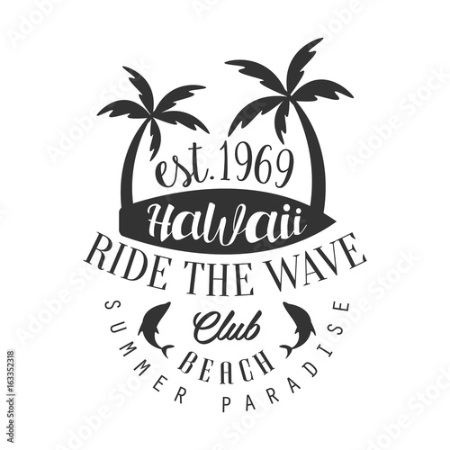 Naklejka premium Ride the wave Hawaii beach club, summer paradise logo template, black and white vector Illustration
