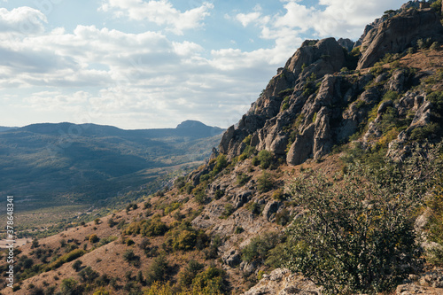 © olgalisa88, Naklejka premium Ridge of brown rocks covered with greenery against a blue sky