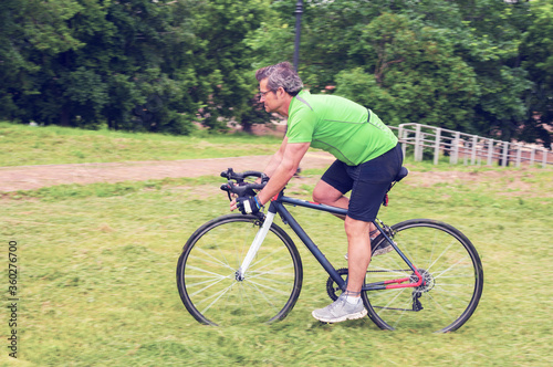 Fototapeta premium Riding adult cyclist on his road bicycle in a park