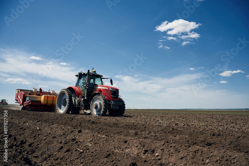 Fototapeta premium Riding, side view. Agricultural machinery, tractor on the field. Conception...