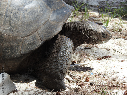 © arentis, Fototapeta premium Riesenschildkröte im Tortoise Sanctuary auf Curieuse, Seychellen