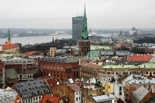 © Dmirii, Naklejka premium Riga, Latvia, November 2019. A modern high-rise building in the middle of a medieval city.