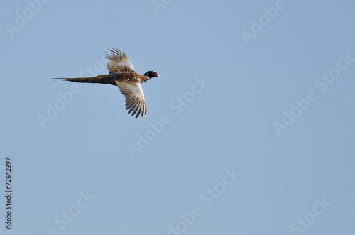Fototapeta premium Ring-Necked Pheasant Flying in a Blue Sky