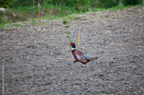 © Diego, Naklejka premium ring necked pheasant or young male phasianus colchicus fagiano strutting or running across the grass in Italy state symbol of South Dakota.