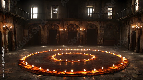 Obraz premium Ring of fire surrounded by dimly lit, weathered walls in an eerie, abandoned...