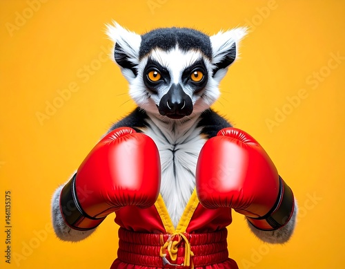 © Luxetify, Obraz premium Ring-Tailed Lemur Boxer in Red Boxing Gloves on Yellow Background