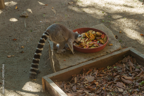 © victor, Obraz premium Ring-Tailed Lemur Feeding on Fresh Fruit Mix from a Bowl on the Ground