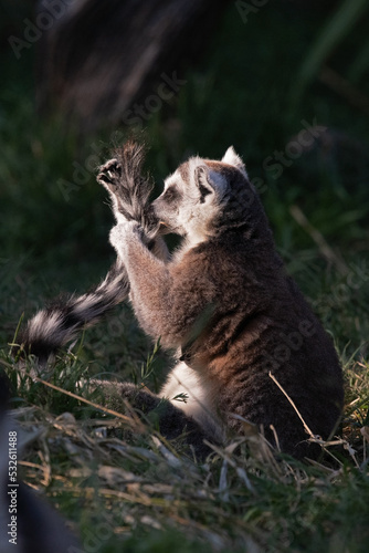 Fototapeta premium Ring-Tailed Lemur Female Mother Grooming Her Tail