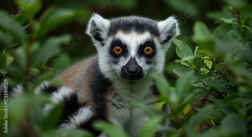 © kapten, Naklejka premium Ring tailed lemur in lush foliage staring forward with intense gaze