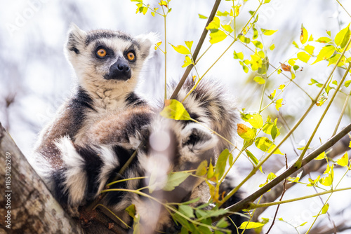 © ronnybas, Fototapeta premium Ring tailed lemur in Madagascar sits on a tree branch surrounded by green leaves