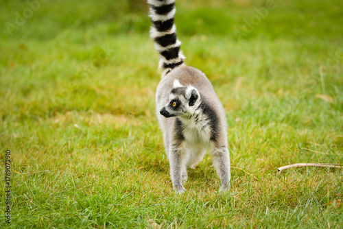 Obraz premium Ring-tailed lemur (Lemur catta) sitting and walking on green grass in a...