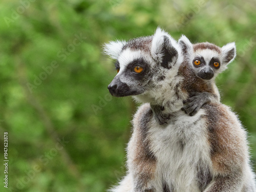 Naklejka premium Ring tailed lemur mother carrying baby on back in green natural space
