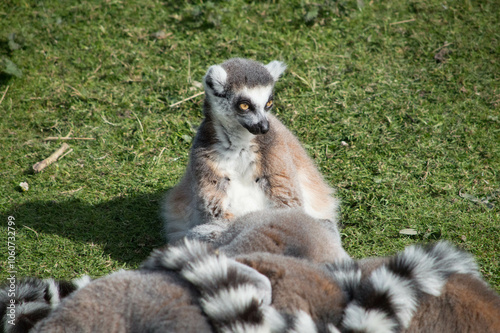 Fototapeta premium Ring Tailed Lemur on look out while others sleep in sun