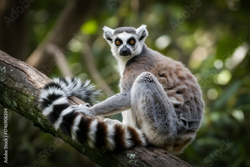 © Musfik, Fototapeta premium Ring-tailed lemur perched on a tree branch amidst lush green foliage