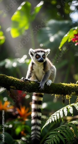 © dayu, Obraz premium Ring-tailed Lemur Perched on Branch in Lush Rainforest.
