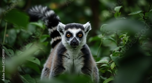 © kapten, Obraz premium Ring tailed lemur portrait amidst lush green foliage and natural light