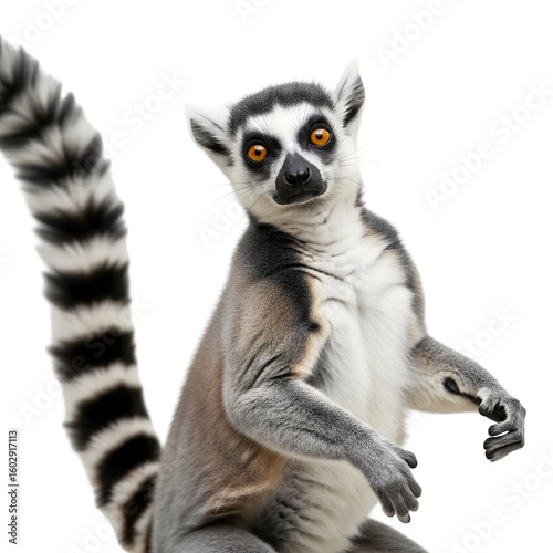 Obraz premium Ring-tailed lemur primate mammal animal portrait with a black and white striped tail isolated on transparent background