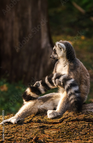 Obraz premium Ring-tailed lemur relaxing on a tree trunk in warm sunlight with striped tail...