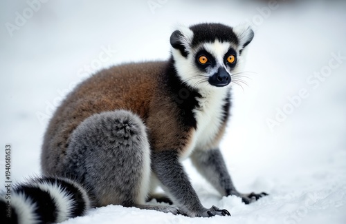 © miss irine, Fototapeta premium Ring-tailed lemur sits in snow, its distinctive black and white tail curled. Wild primate has bright orange eyes and curious expression, looking directly forward, emphasizing its unique face and fur.