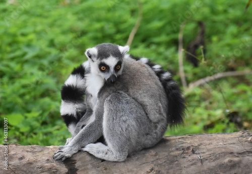 Naklejka premium Ring tailed lemur sitting on a tree stump, at the Avifauna in The Netherlands.