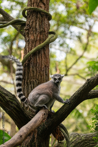 © Anna Zaro, Fototapeta premium Ring tailed lemur standing on tree branches, striped tail raised, textured bark and vine visible, forest background with shallow depth of field.