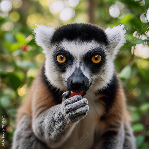 © ALMAMUN, Obraz premium Ring tailed lemur with striking orange eyes eating a red berry in a lush green forest