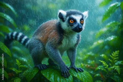 © Who is Danny, Naklejka premium Ring-tailed lemur with vivid orange eyes standing on wet jungle leaves during rainfall, surrounded by lush green foliage and soft light. Ai generative